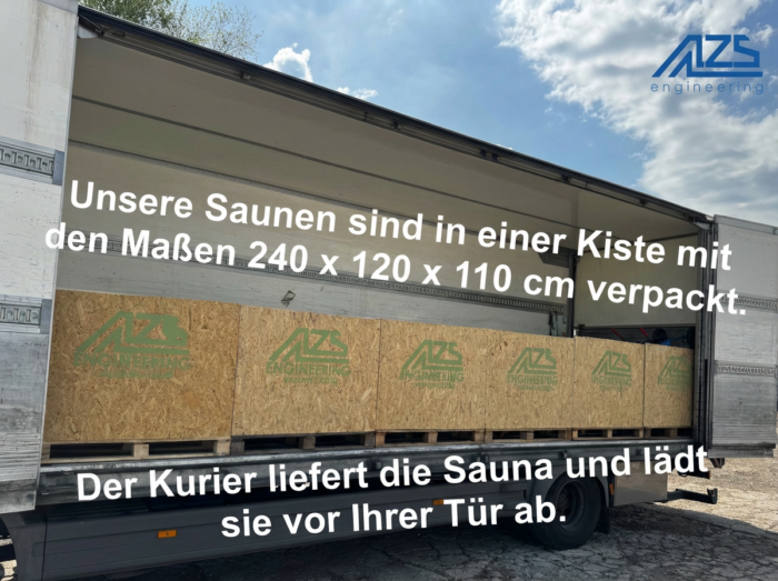 Lieferung und Verpackung Wir möchten Sie darüber informieren, dass unsere Fasssaunen in einer stabilen Transportbox geliefert werden. Die Abmessungen der Box betragen ca. 240 x 120 x 100 cm, bei einem Gewicht von über 800 kg.